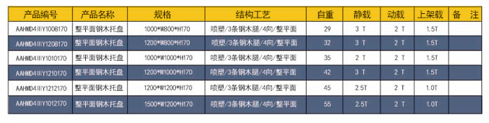 四向三腿——整平面鋼木托盤 技術(shù)參數(shù)說(shuō)明: 產(chǎn)品編號(hào):AAHMD4ⅢY1512170 產(chǎn)品規(guī)格: 1500*1200*170 防銹工藝: 靜電銀粉沙紋噴塑 產(chǎn)品靜載: 2000KG(均勻載重) 產(chǎn)品動(dòng)載: 2000KG(均勻載重) 產(chǎn)品上架: 1500KG(均勻載重) 主要用途: 倉(cāng)庫(kù)、車間周轉(zhuǎn)、高庫(kù)物流及倉(cāng)儲(chǔ)